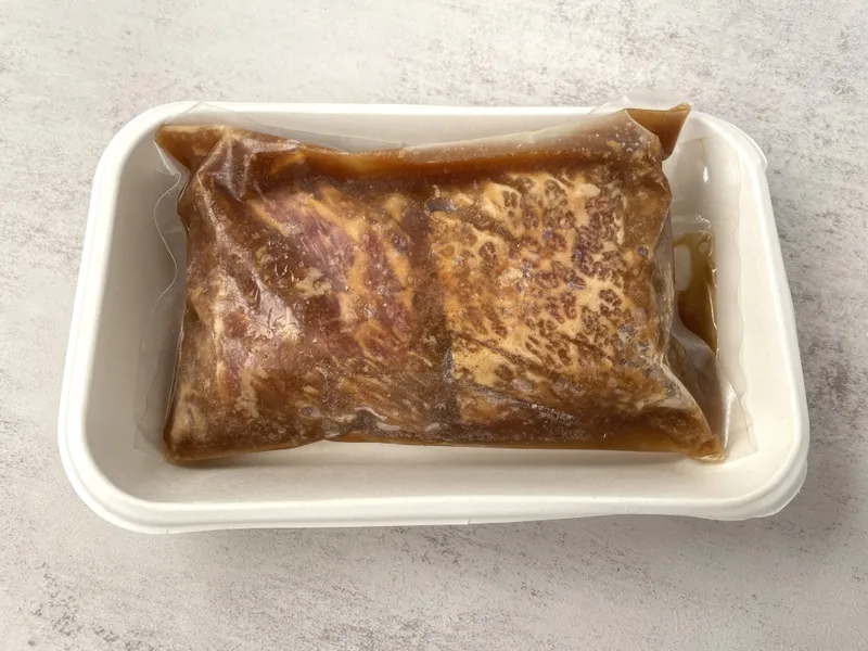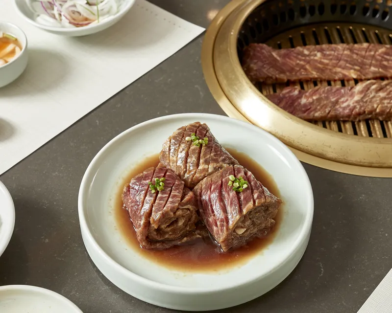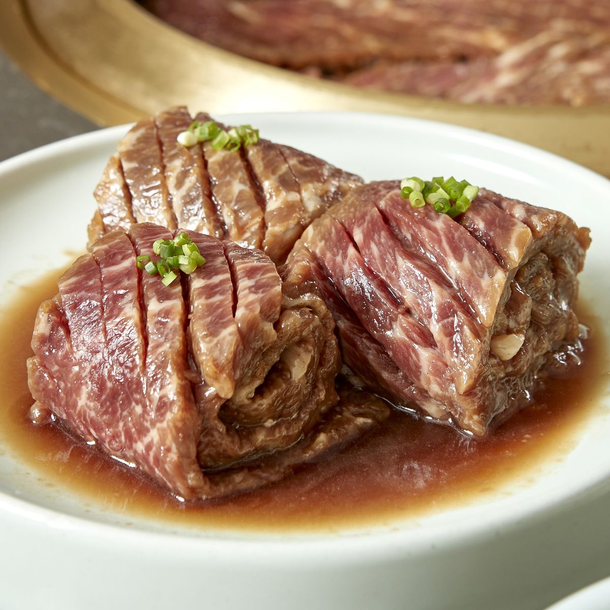 갈비 중 가장 맛이 좋고 육즙과 마블링이 풍부한 꽃갈비를 사용했습니다. 다이아몬드 칼집으로 한층 더 부드러워진 식감을 맛보실 수 있어요. 양념이 잘 베인 상태로 숙성되어 적절한 단맛과 담칠맛을 담아냈습니다.
