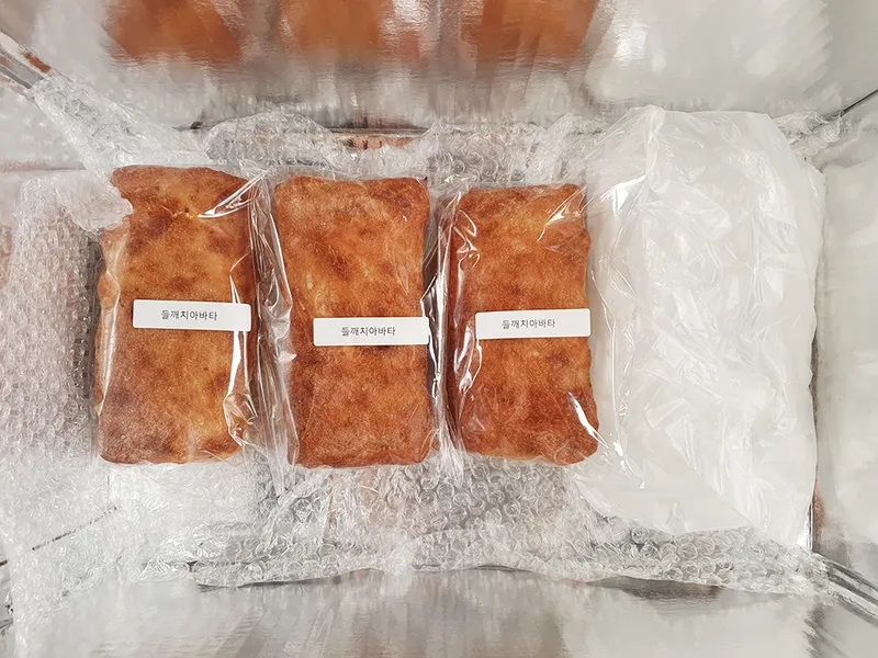 국내산 들깨를 그대로 넣었고, 직접 제분한 누룽지로 종반죽을 만들기 때문에 더부룩하지 않고 소화가 잘 되실 거예요. 풍미와 건강을 위해 100% 유기농 밀가루를, 엑스트라 버진 올리브오일을, 물 대신 돼지감자 차를 넣어 만들었어요. 밀가루의 찬 성질을 중화시키기 위해 따뜻한 성질의 생강가루까지 넣었답니다!