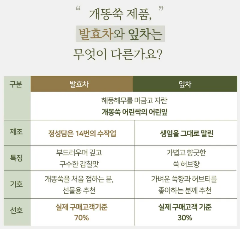생잎을 그대로 말려 가볍고 향긋한 허브향이 그대로 느껴지는 잎차와 달리, 발효차는 14번의 작업을 거쳐 깊은 감칠맛을 느껴보실 수 있습니다. 부드러운 목넘김과 구수한 맛이 좋아 개똥쑥을 처음 접하시는 분들께 추천드려요! 원료 생산부터 가공, 발효까지 모든 과정을 모두 제 손으로 하나하나 진행하고 있답니다.