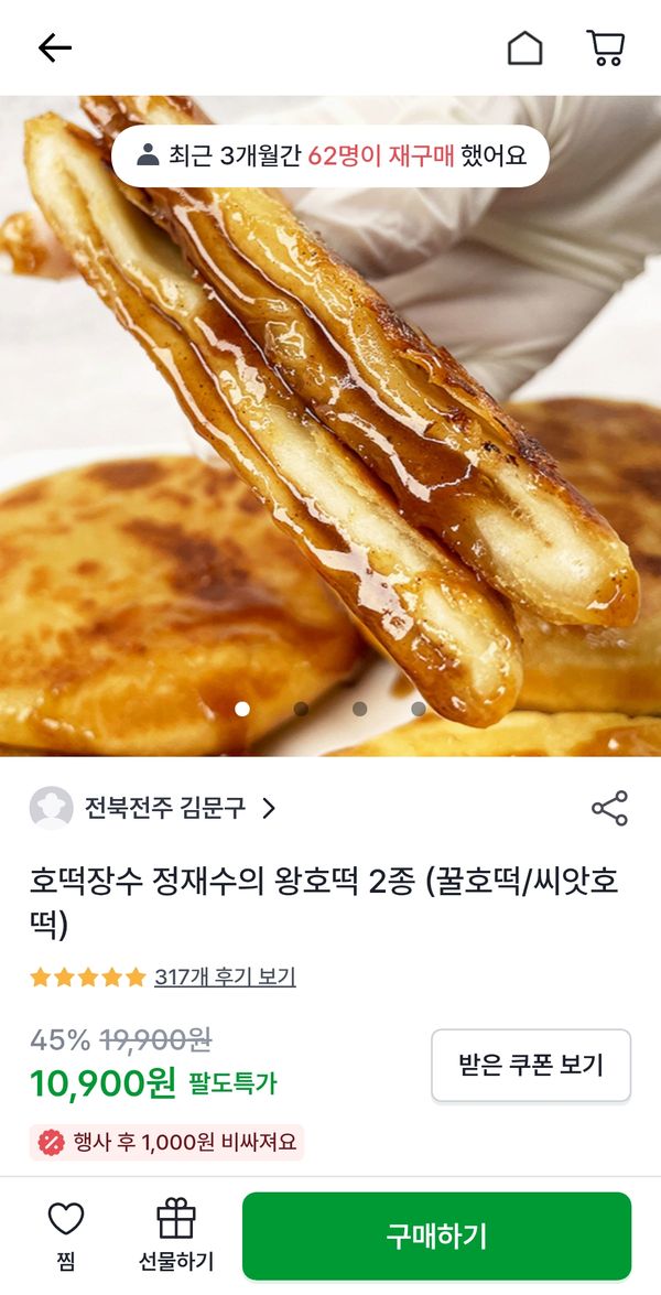 너무 맛있어서 재주문했어요 렌지에 일분 돌려서 후라이팬에 구워봣는데 진짜진짜 달달하니 맛나요 안에 꿀이 많이 들어서 더 맛나는거 같아요 잘 먹겠습니다