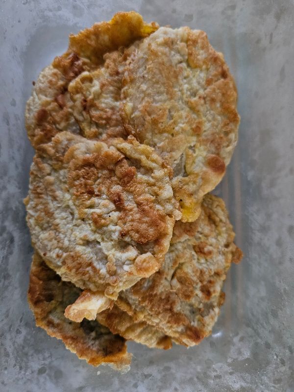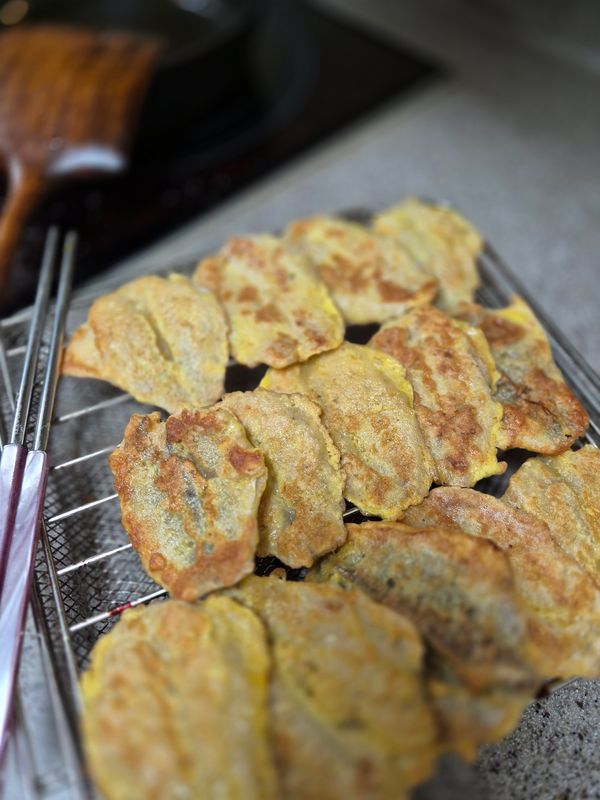 크기가 이렇게 작아서야~ 생선전이 구우면 약간 수축하잖아요. 그리고 후기에 비린맛에 대한 언급이 있어 양파즙을 좀 적셔서 했는데도 여전히 비린 맛이. 글쎄~ 마늘즙을 야무치게 뿌리고 소금간도 더 세게 했었으면 맛이 있었으려나? 나는 별로인데 남편은 따뜻하니까 맛있다고 인사치레 합니다. 조기전 한 번 경험해봤습니다.