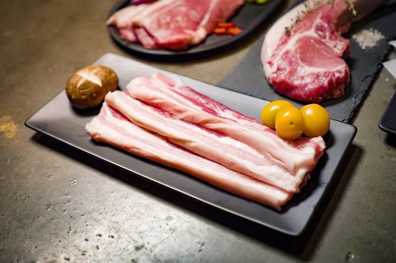 갈비를 떼어낸 부분에서 복부까지 넓고 납작한 모양의 부위로써, 붉은 살코기와 지방이 삼겹의 막을 형성하고 있어 씹을수록 고소하며 풍미가 좋아요.