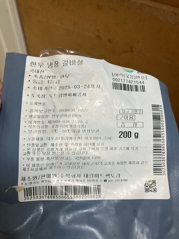 안내문 하나 들었습니다. 분명 200그램 포장 두 개 구입했어요. 팔도감 측에 2팩 주문했다는 송장사진 ,고기사진과 함께 누락이라고 연락했는데 업체측에서 씨씨티비 조사결과 고기 2덩어리 넣었다고 한다네요. 그럼 고기가 증발했나요?