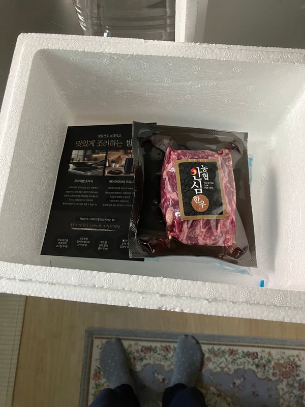 스티로폼 박스안에 얼음팩 하나, 고기 한덩어리,