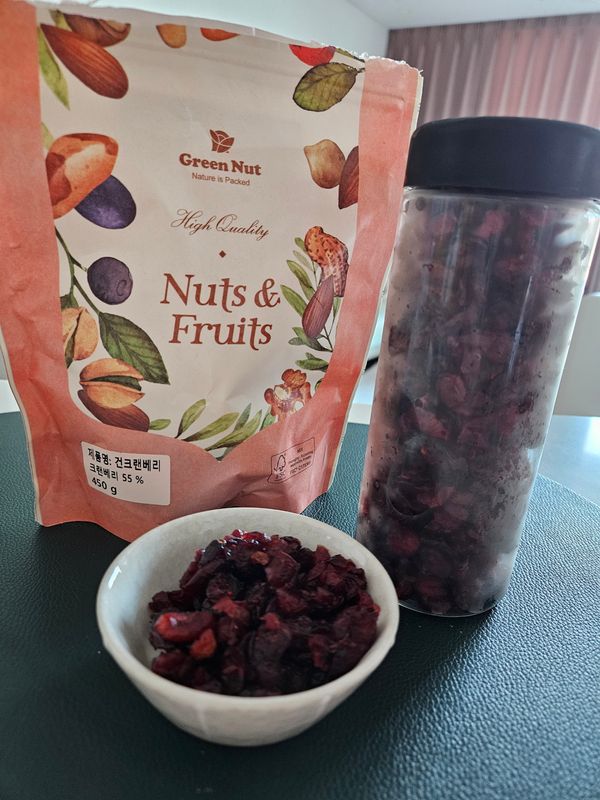 건크랜베리는 원물 그대로 먹어도 상큼한 맛이 느껴지지만, 샐러드나 빵에 한 줌 넣어 드셔도 맛있어요.
