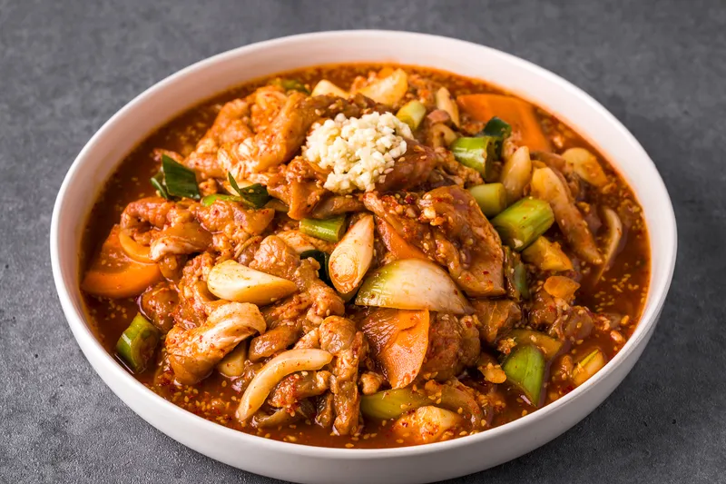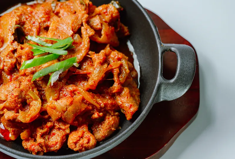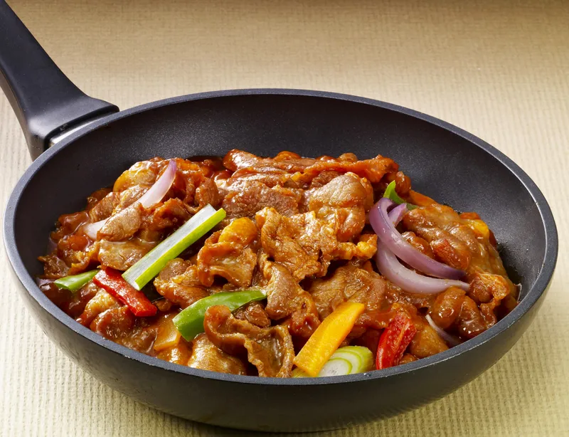 고추장 소스가 잘 배어든 제육볶음입니다. 남녀노소 호불호 없이 좋아하는 인기 반찬으로 후라이팬에 그대로 구워주기만 하면 완성이에요. 흰 쌀밥과 함께 쓱쓱 비벼 먹으면 이만한 밥도둑이 없어요.