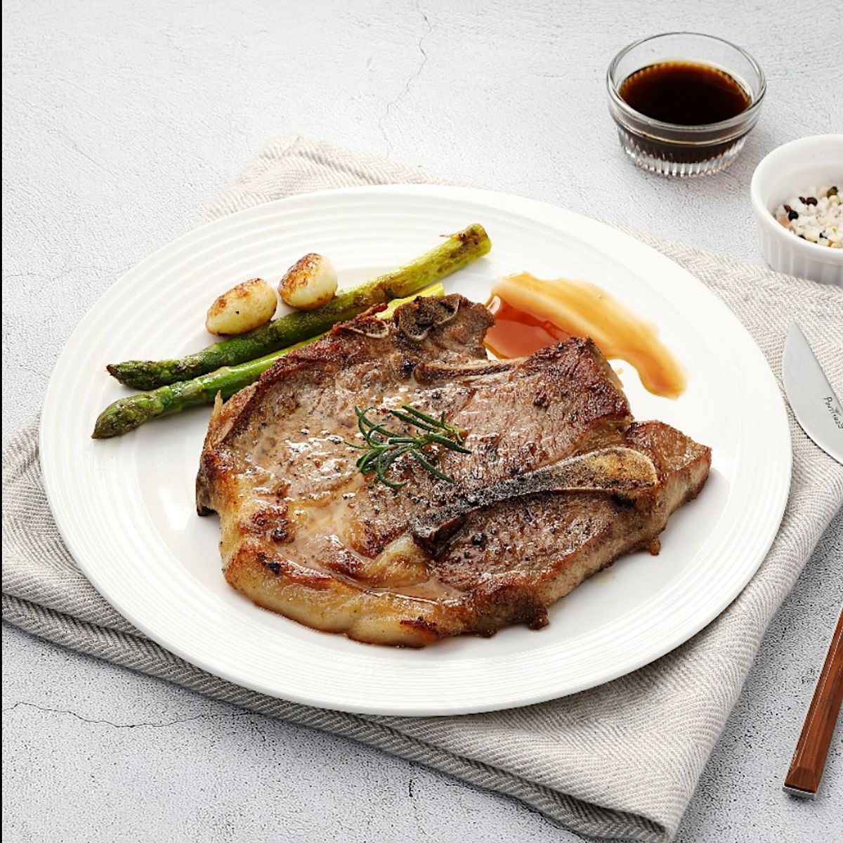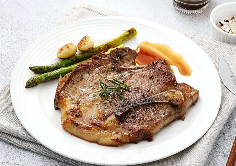 소고기 엘본 스테이크처럼 돼지고기 목등뼈 쪽을 잘라 만든 특별한 목살이에요. 돼지 등심 및 목심과 같은 다양한 부위를 한 번에 즐길 수 있어 더욱 풍성한 맛을 경험할 수 있습니다.
