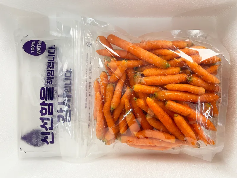 와우, 속 포장이 엉망이네요. 물에 담가져 왔어요. 얼음포장이 찢어져서 녹으니까 물속에 당근이ㅡ 당근 담은 비닐 속으로 물이 들어가 있고 ㅡ 6.25때 난리는 난리도 아녀. 사진을 찍어둘 걸. 물 버리는데 급급해서리.