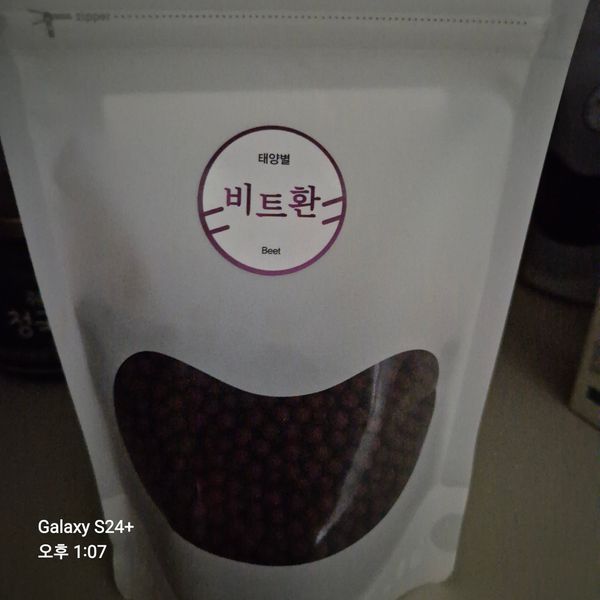 남편이 한 알 씹어 먹어봤는데 비트 맛이 확 느껴진답니다 근데 아쉬운 점은 먹는 방법이 동봉이 안되있어서 사이트 들어와서 다시 읽어봤네요