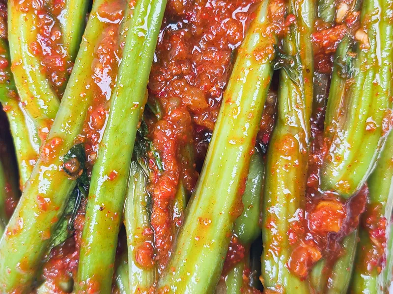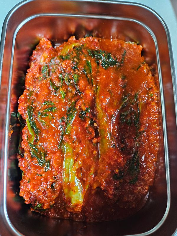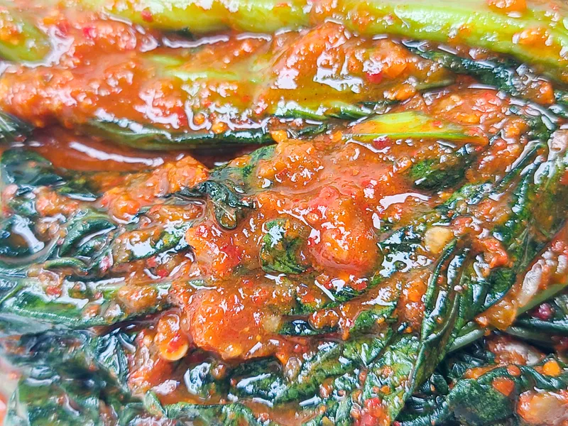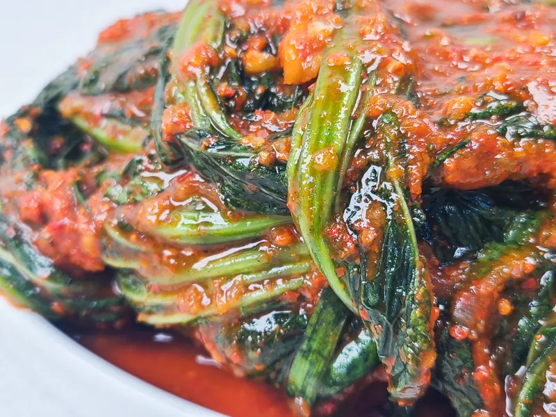 갓 특유의 알싸한 향과 매운맛이 입안에서 톡 터지는 중독성 강한 김치, 갓김치입니다. 씹을수록 감칠맛이 살아나고, 기름진 음식과 찰떡궁합을 자랑해요. 한입 먹는 순간 확 도는 그 매운맛이 밥도둑이 따로 없습니다.