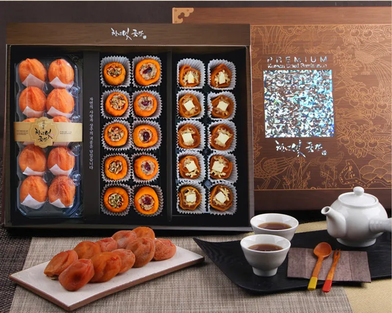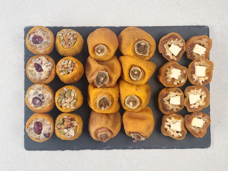 담백한 반건시, 유자청, 크림치즈로 풍미를 더한 곶감단지, 부드럽고 고소한 크림치즈호두말이까지! 세 가지를 한 번에 맛볼 수 있어 선물용으로 제격입니다. 한눈에 봐도 정성 가득한 모양새로 먹기에도 보기에도 훌륭해요.