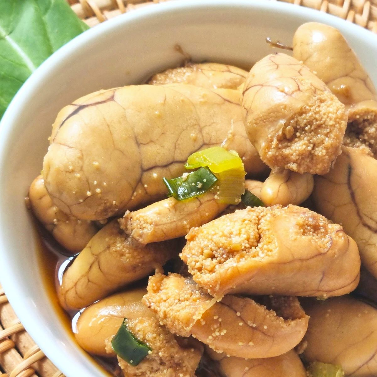 알이 꽉차고 탱글탱글한 명란을 한번 데쳐낸 후, 찬 물에 불순물을 온전히 씻어냅니다. 짜지 않은 저염 간장으로 알맞게 간을 한 뒤, 파를 넣고 조려 맛있는 명란 조림을 만듭니다.
