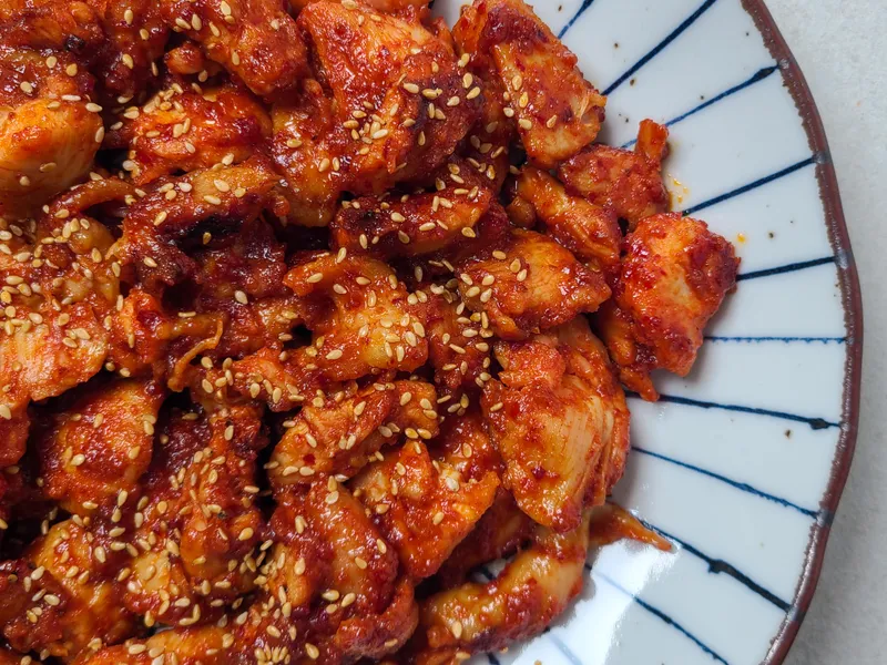 매콤 달콤한 특제 양념이 부드러운 닭 안심과 만나 더욱 특별해졌어요. 한 입 베어 물면 입안 가득 퍼지는 감칠맛이 일품이에요! 직접 개발한 비법 양념으로 재워 깊은 맛을 더했답니다.