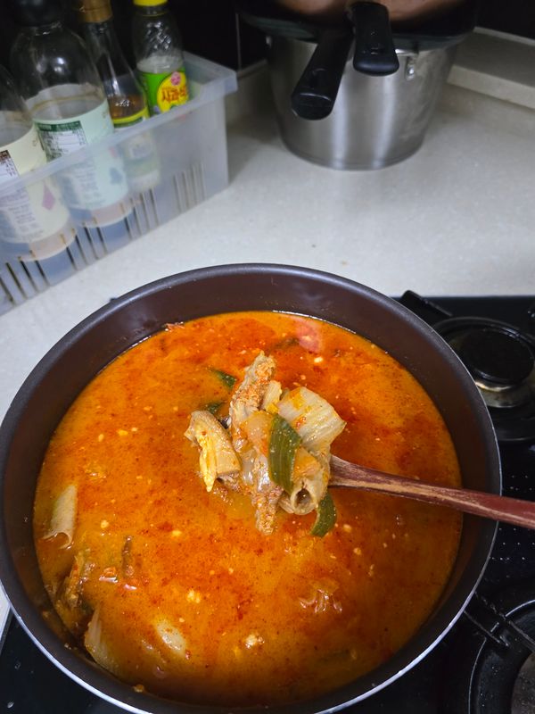 쉽게 끓여 먹을수있다는건 좋네요 내용이 사진과 200프로 달라서 실망했어요 휘휘저어야 건지가 한젓갈 떠집니다 알배추라도 많이이넣으셔야 할듯요