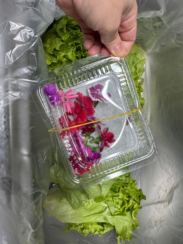 유러피안 샐러드 다른 곳에서도 자주 주문 해 봤는데, 이렇게 깔끔하게 정렬 되어 온 것은 처음 봐요~ 3가지 종류로 열 포기 정도 있었던거같아요~ 싱싱하고 양이 많아서 쌈도 싸먹고 샐러드도 해먹고 샌드위치도 해 먹었답니다 함께 넣어 주신 식용 꽃도 너무 예쁘네요!
