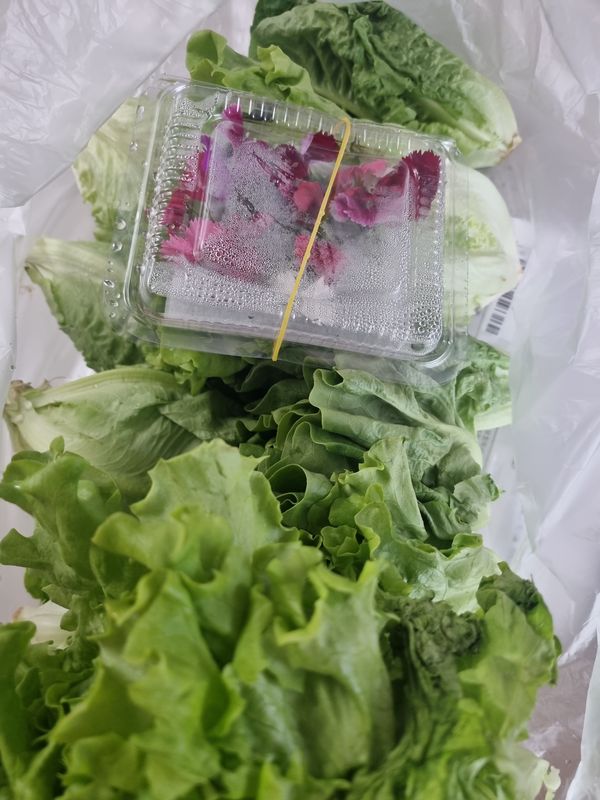 유러피안 샐러드 다른 곳에서도 자주 주문 해 봤는데, 이렇게 깔끔하게 정렬 되어 온 것은 처음 봐요~ 3가지 종류로 열 포기 정도 있었던거같아요~ 싱싱하고 양이 많아서 쌈도 싸먹고 샐러드도 해먹고 샌드위치도 해 먹었답니다 함께 넣어 주신 식용 꽃도 너무 예쁘네요!