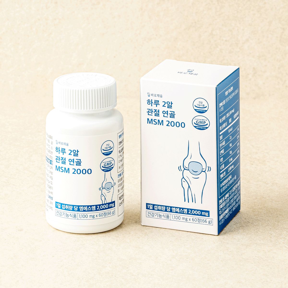 '바로채움 하루 2알 관절 연골 MSM 2000'은 치료나 예방 목적의 의약품이 아닌 '건강기능식품'입니다. 질병이나 그로 인한 증상이 있는 경우, 의사 등 전문가와 상의하세요.