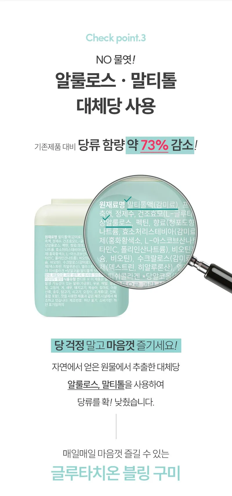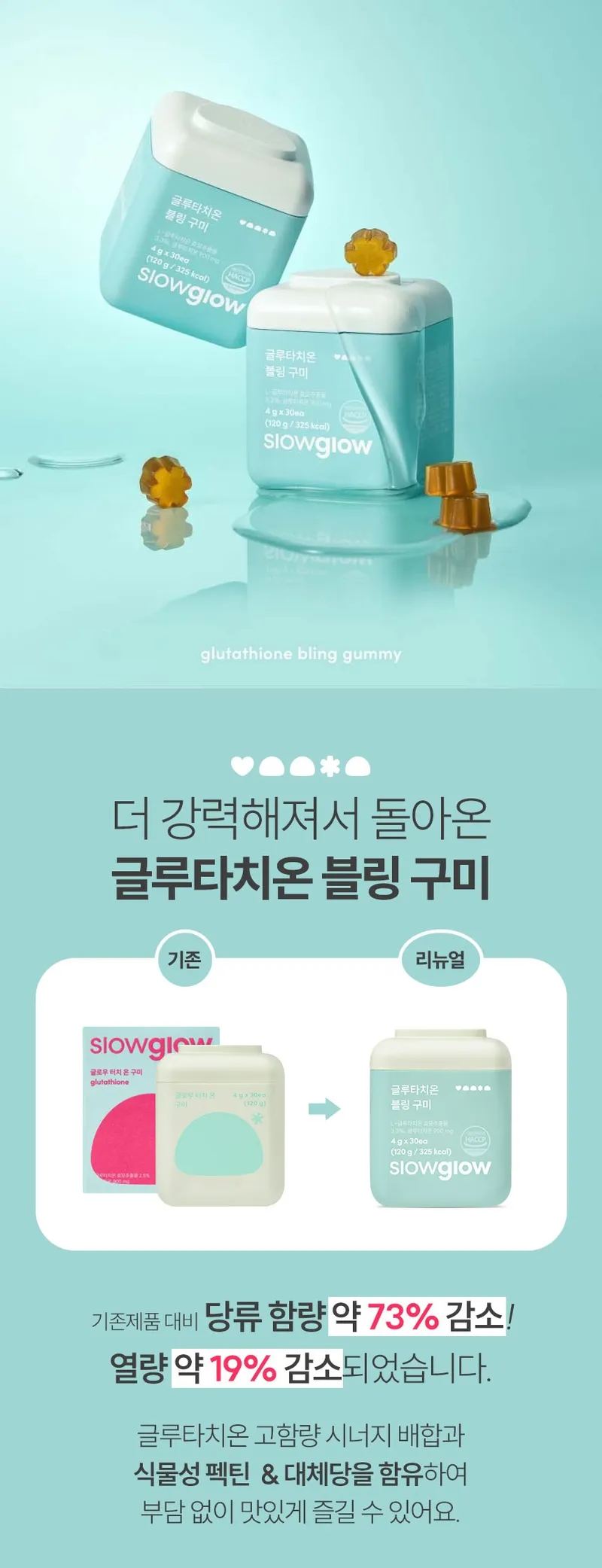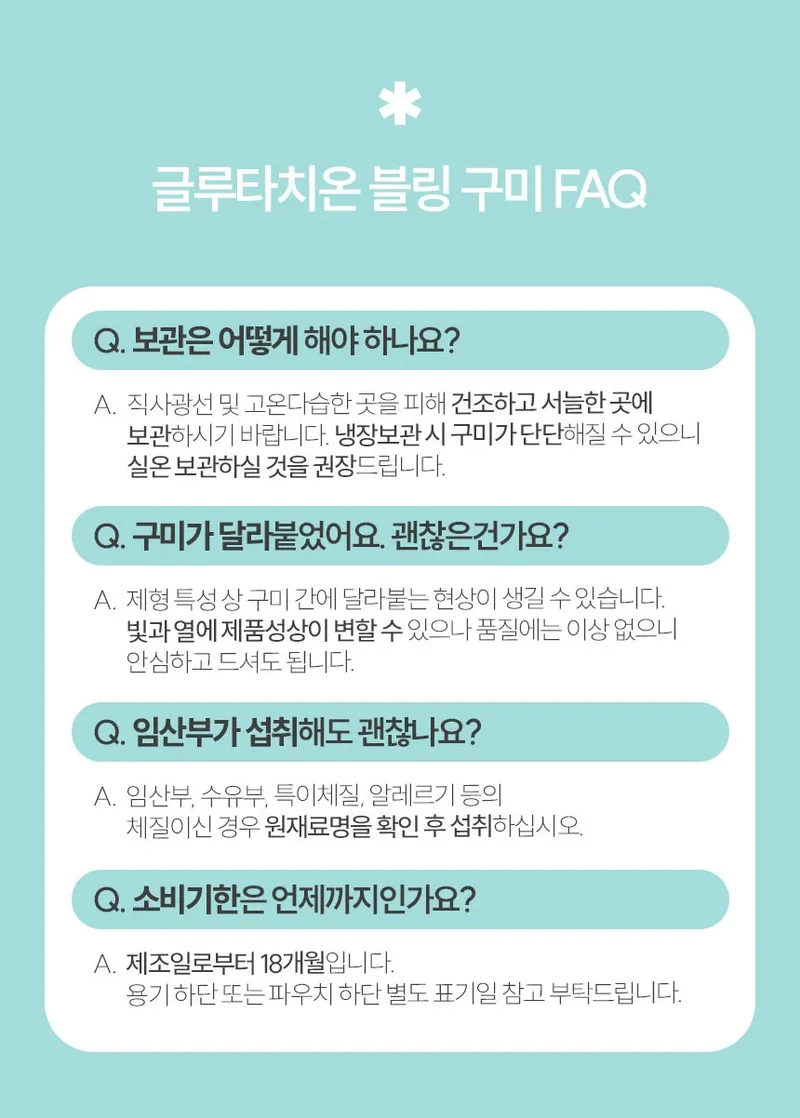 엘라스틴, L-글루타치온, 히알루론산, 비오틴, 저분자피쉬콜라겐이 함유된 글루타치온 블링 구미 캔디입니다. 간편하게 영양관리 하세요.