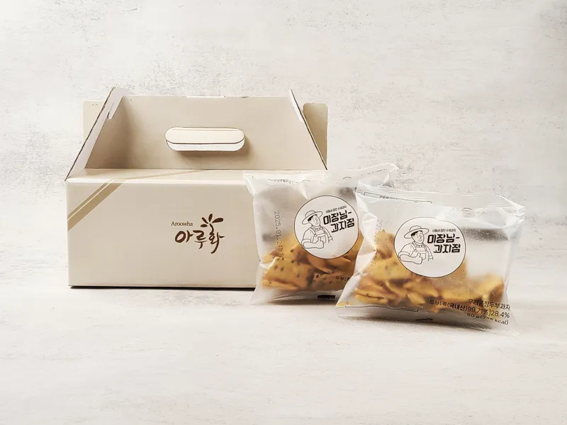 선물하기 좋도록 상자에 예쁘게 담아 준비했어요. 소중한 분에게 감사한 마음을 담아 두부과자를 선물해 보세요. 부담 없는 고소 담백한 맛으로 모두가 만족할 거예요!