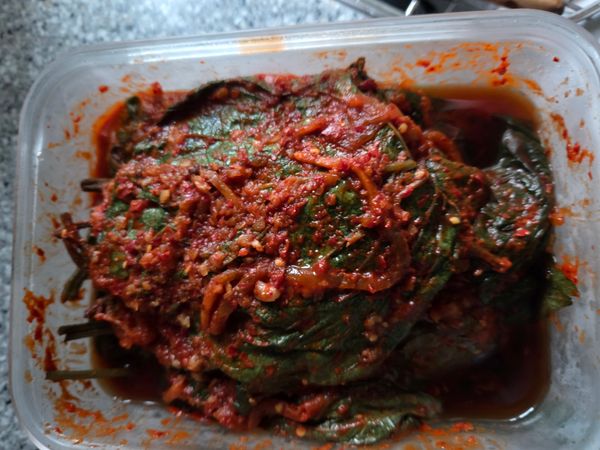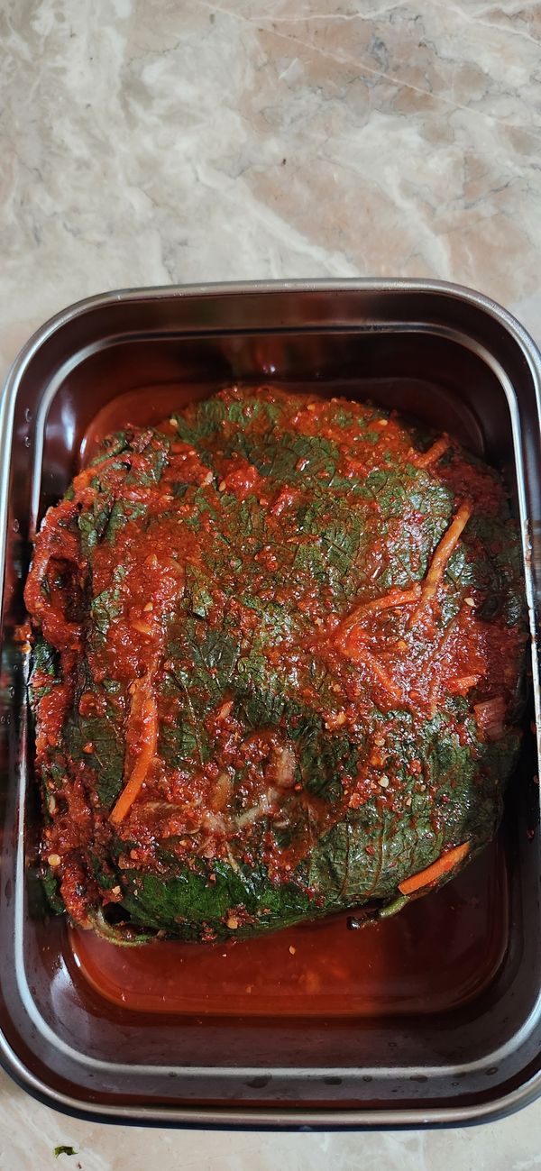 깻잎이 질길줄 알았는데 연하고 처음엕 매운것같았는데 먹다보니 맵지않고 맛있어서 뱇추김치가 깻잎에 만렸어요