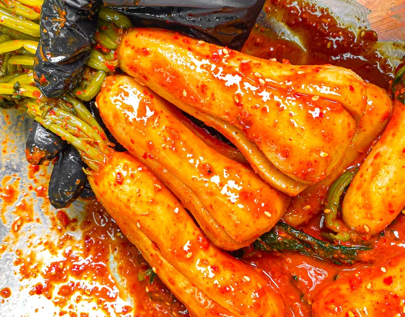 매콤 시원한 총각김치는 한국인의 밥상에 빠질 수 없는 반찬이죠. 아삭아삭한 총각무로 만들어 식감 또한 일품이에요. 라면과 같이 드시면 얼마나 맛있게요~😆