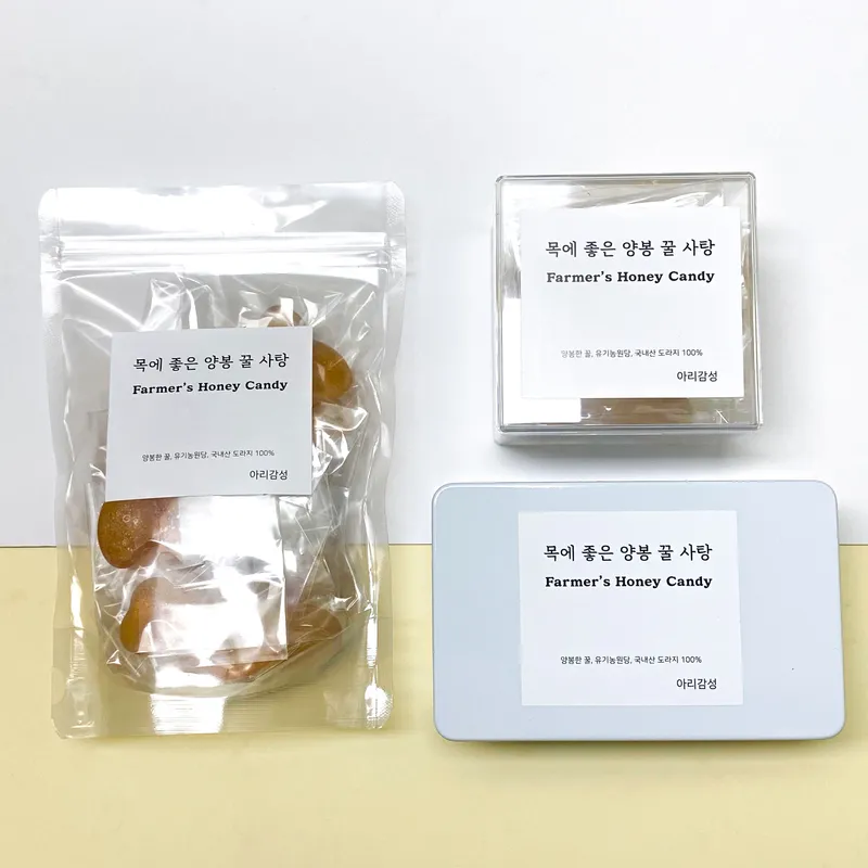 가족이 직접 양봉해서 수확한 꿀이 이 사탕의 주재료입니다. 꿀이 다량으로 들어간 상품이기 때문에 엿처럼 이에 살짝 달라붙는 식감입니다.