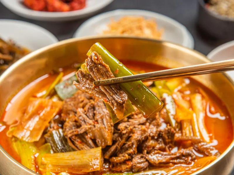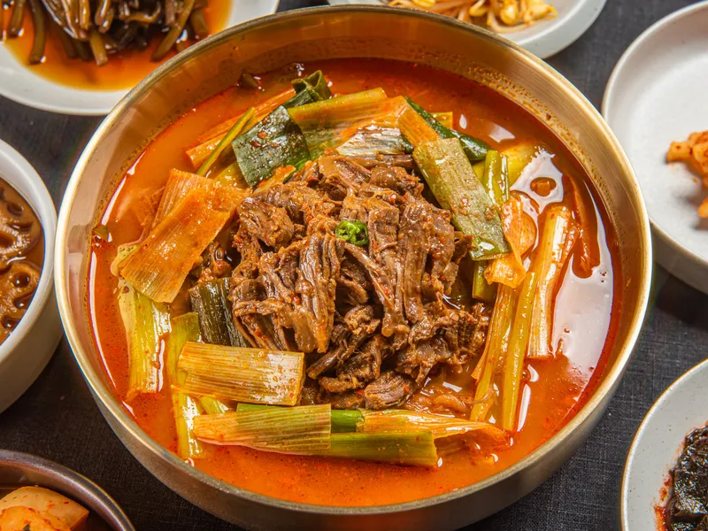 진하고 시원칼칼한 국물은 저희의 자부심입니다. 육개장의 얼큰한 국물 맛은 풍부한 건더기에서 우러나옵니다. 추가 재료 없이도 넉넉하게 즐기실 수 있도록 건더기를 푸짐하게 넣어드리고 있어요🙌 푹~ 고아내 뭉근하게 풀어진 파와 고기가 얼큰한 국물을 가득 머금어 그 맛이 아주 좋습니다.