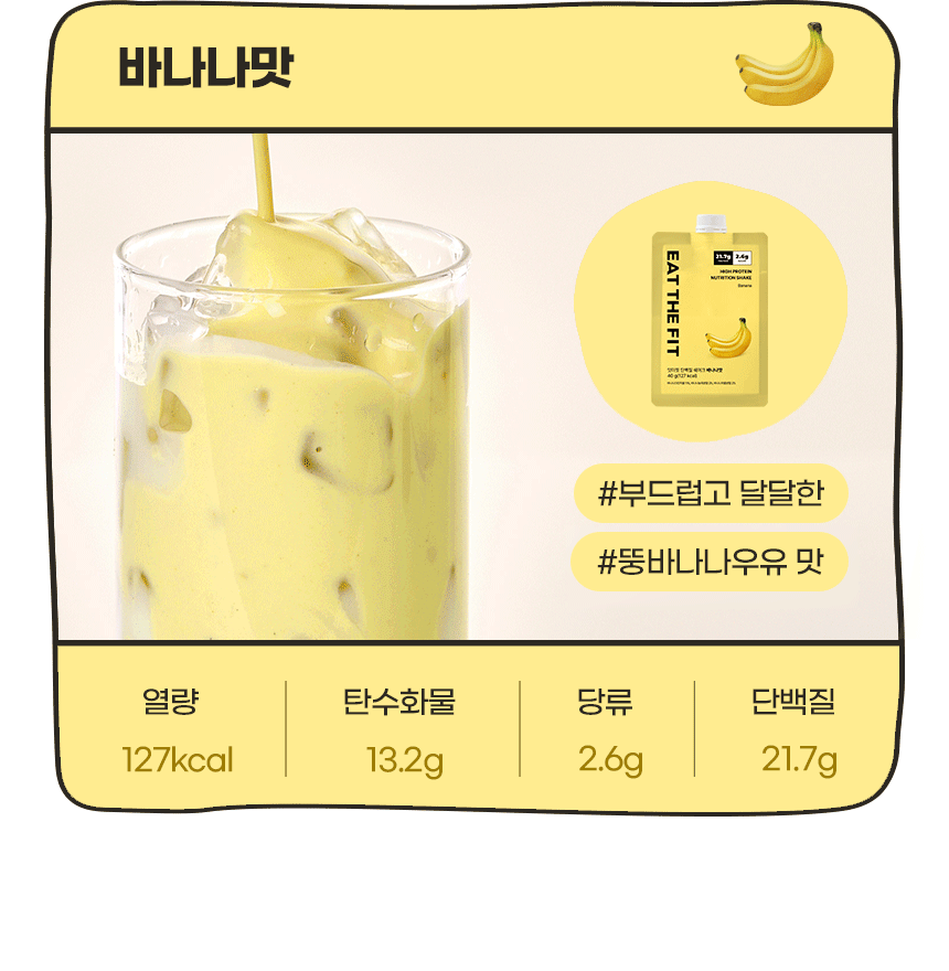 진한 바나나우유를 먹는 듯 부드럽고 달콤한 맛을 느낄 수 있는 단백질 쉐이크