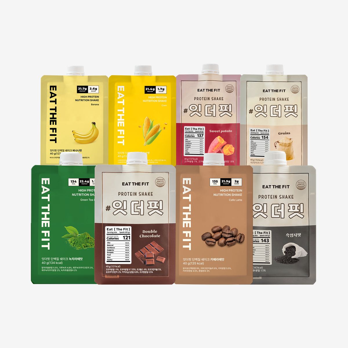 식단 관리를 더 맛있게 하는 방법! 지금 바로 단백질 쉐이크 8종과 함께해 보세요. 완벽한 맛을 위해 117회 샘플링 작업으로 맛별 최상의 레시피를 찾았답니다. 더블초코, 녹차, 흑임자, 미숫가루, 고구마, 카페라떼, 옥수수, 바나나까지 각양각색 매력 넘치는 8가지 맛의 단백질 쉐이크를 만나볼 수 있어요!