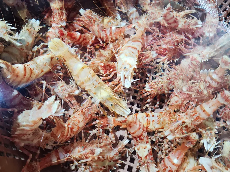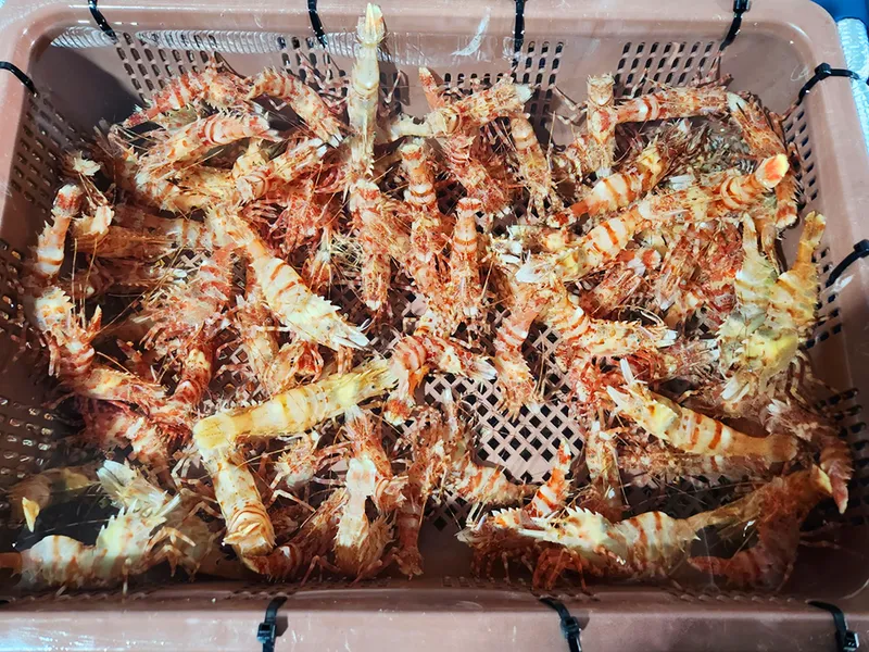 우리나라에서 가장 값비싸고 귀하게 여기는 독도새우 삼총사 중 하나인 닭새우입니다. 주로 독도 인근에서 어획되어 도화새우, 꽃새우와 함께 독도새우라고 불립니다.