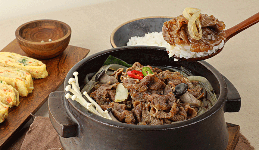 양념이 골고루 배어 있는 달콤 짭조름한 뚝배기 불고기입니다. 은은하게 퍼지는 불고기 향에 촉촉한 소고기 식감까지 더해져 어른, 아이 할 것 없이 모두가 맛있게 즐길 수 있어요. 국물에 밥을 비벼 먹으면 든든한 한 끼로도 손색없습니다.