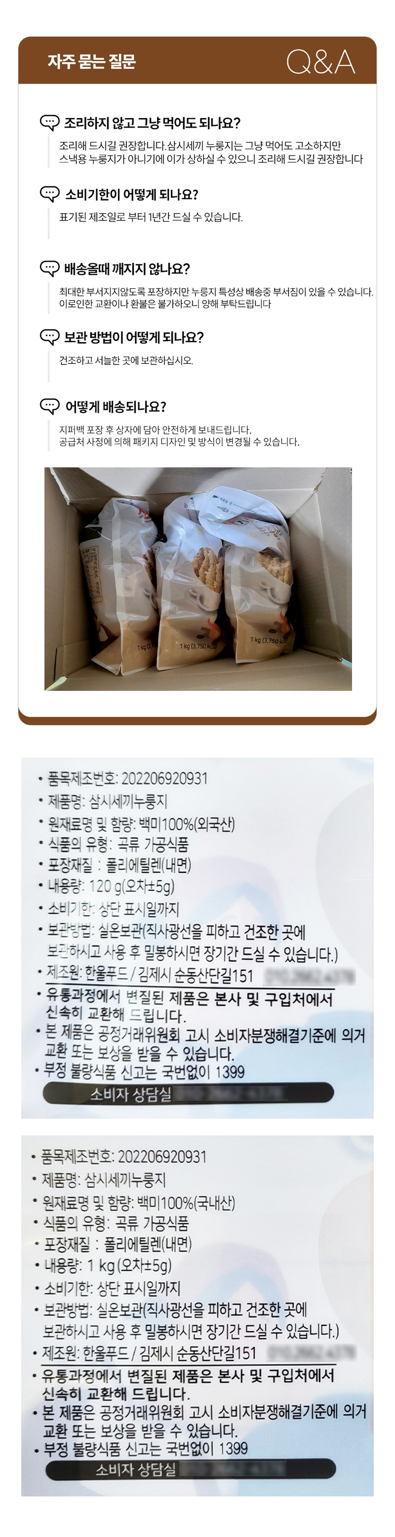 푸드맛남 삼시세끼 고소한 한끼 식사 누룽지 1kg x 3봉