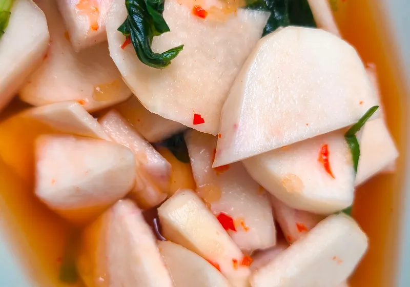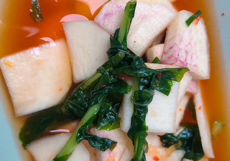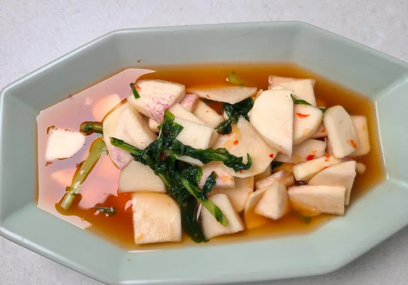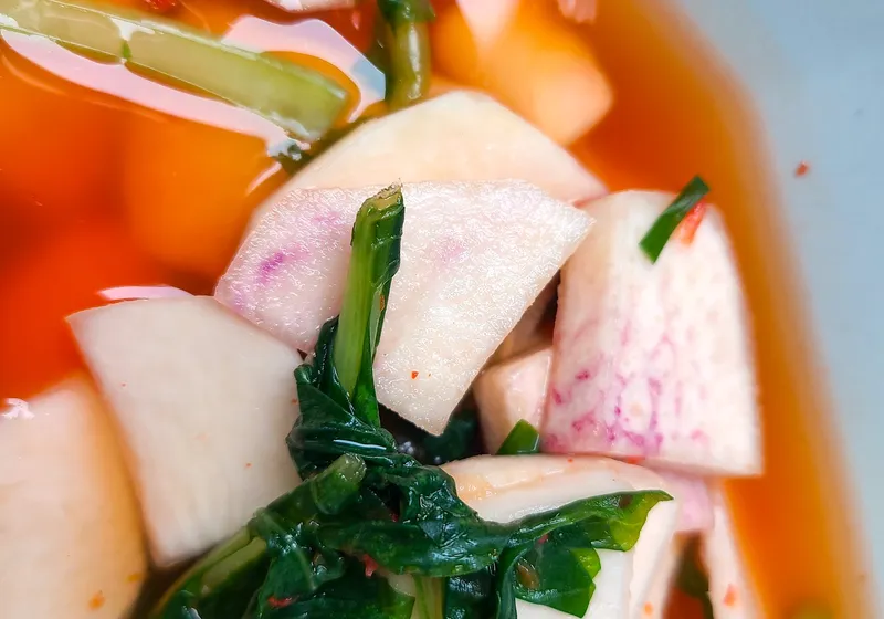 순무와 열무가 어우러져 특별한 조화를 이룬 김치입니다. 아삭하고 시원한 식감이 입안에서 살아나요. 재료의 풍미를 그대로 담아 깊고 풍부한 맛을 선사합니다.