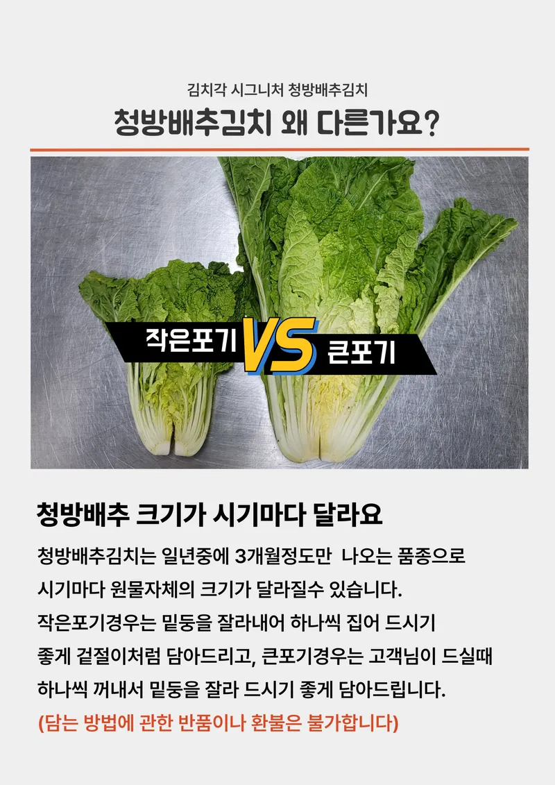 청방배추김치는 4월 말에서 10월 중반까지만 생산하는 기간 한정 경상도 별미김치입니다. 아삭아삭하면서도 숙성시키면 깊은 감칠맛을 맛볼 수 있습니다. 원재료 맛을 최대한 느끼실 수 있도록 자극적이지 않게 담았습니다.