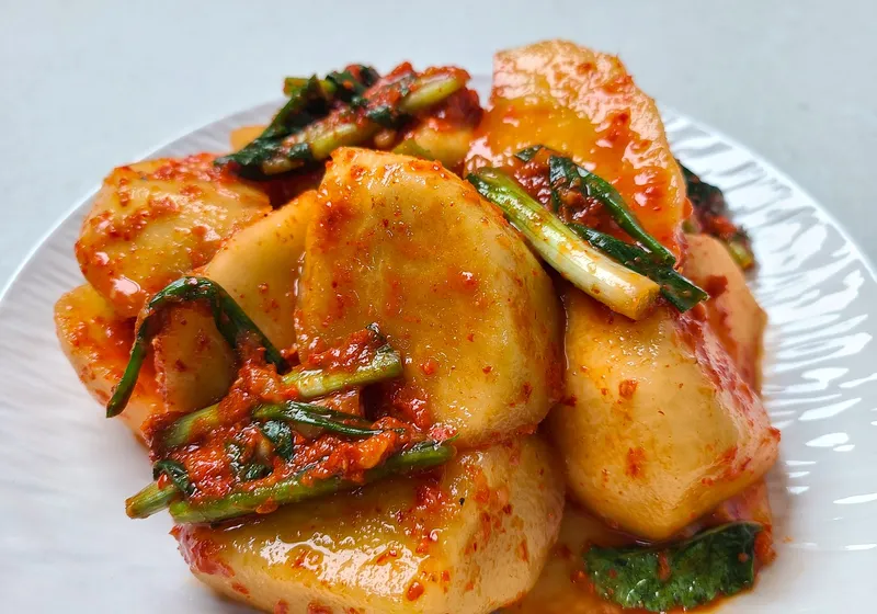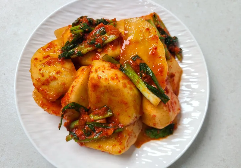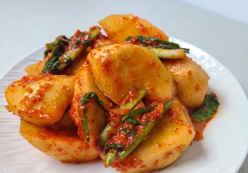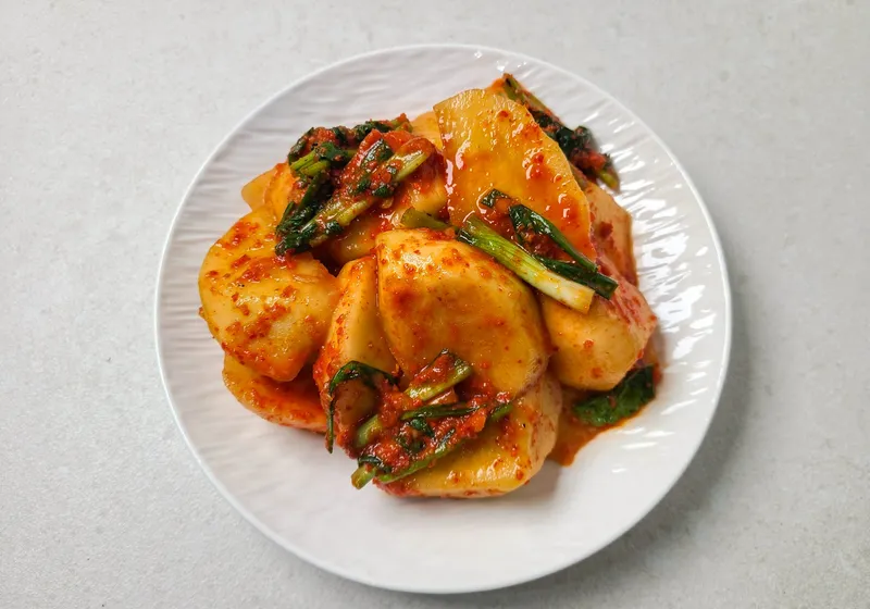 곱게 손질된 석박지는 아삭하고 단단한 식감이 특징이에요. 무의 탄탄한 맛이 살아있어 오도독 씹히는 특별한 매력을 느낄 수 있습니다.