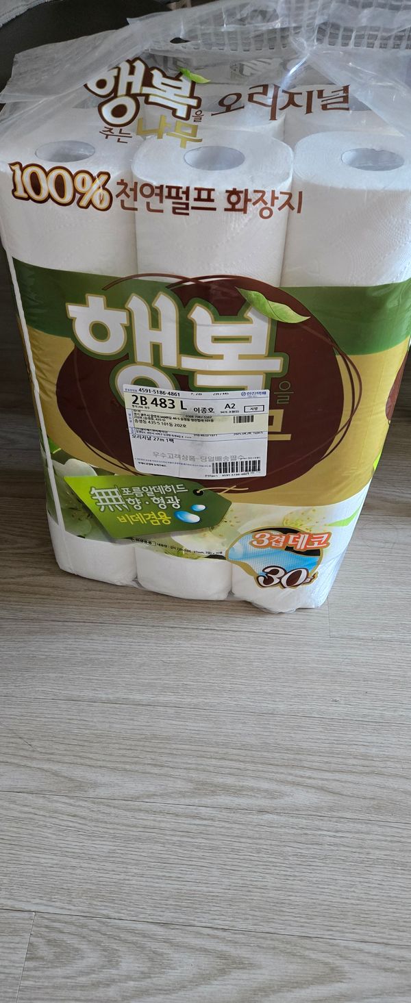 배송,포장이 화장지 비닐에 바로 택배주소지 붙여서 오니 당황했어요..위생상 겉비닐이라도 하나 씌워주심 좋았을텐데...위생용품인데 마트서 바로 사온것도 아니고 택배로 오다보니 포장지에 구멍이 날려고 하는 자국이 생겨 찢어지기 일보직전이니...택배받고,기분이 ㅠ...