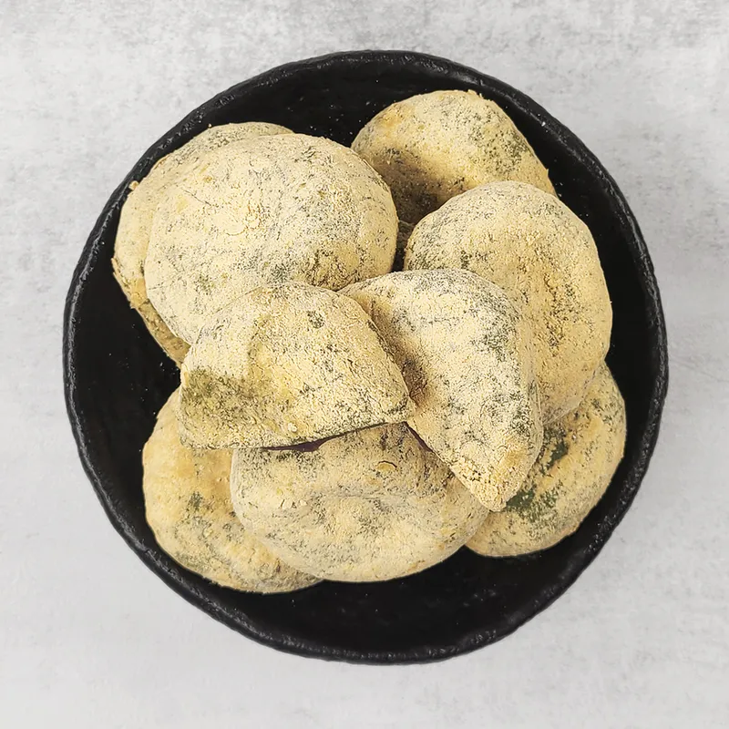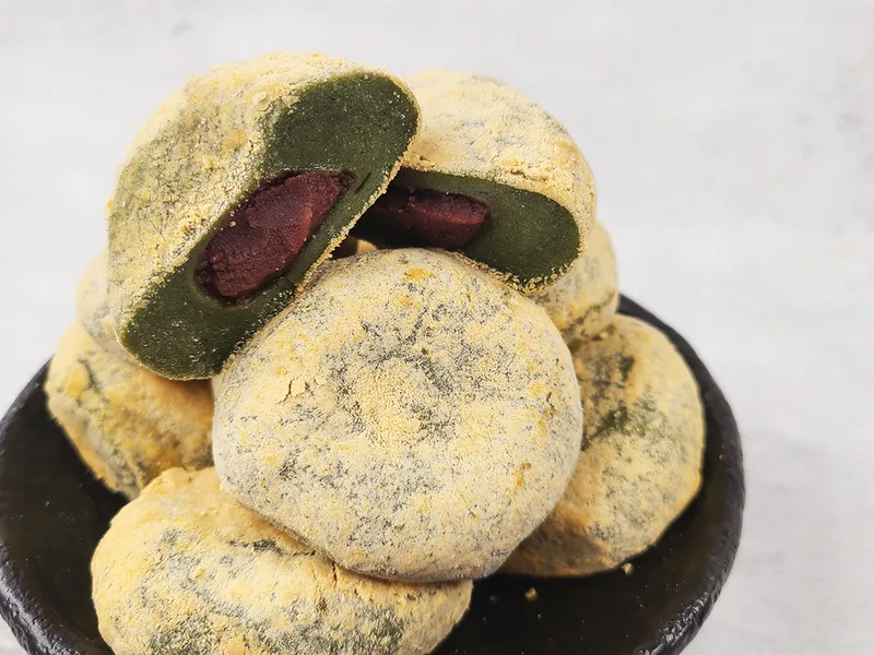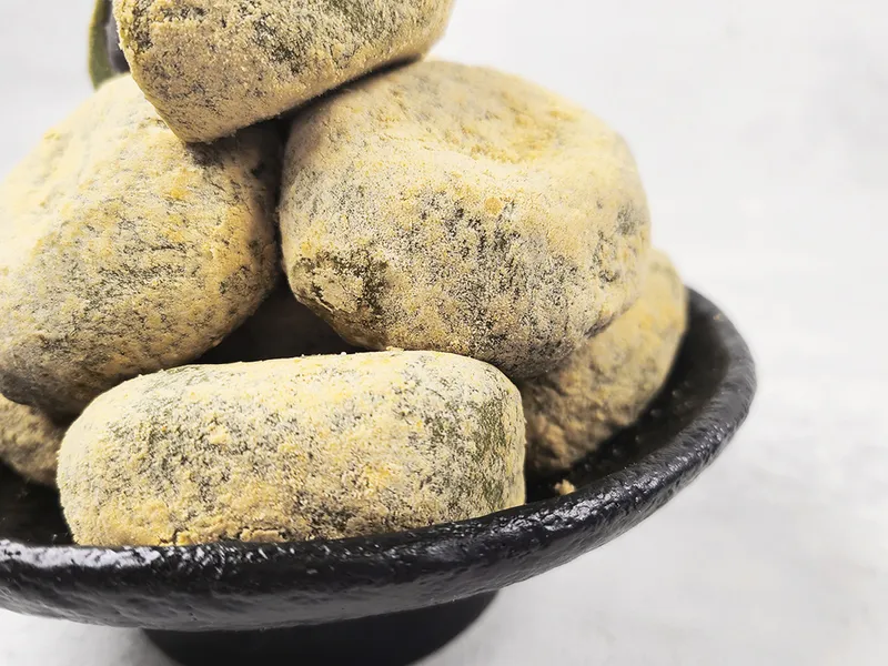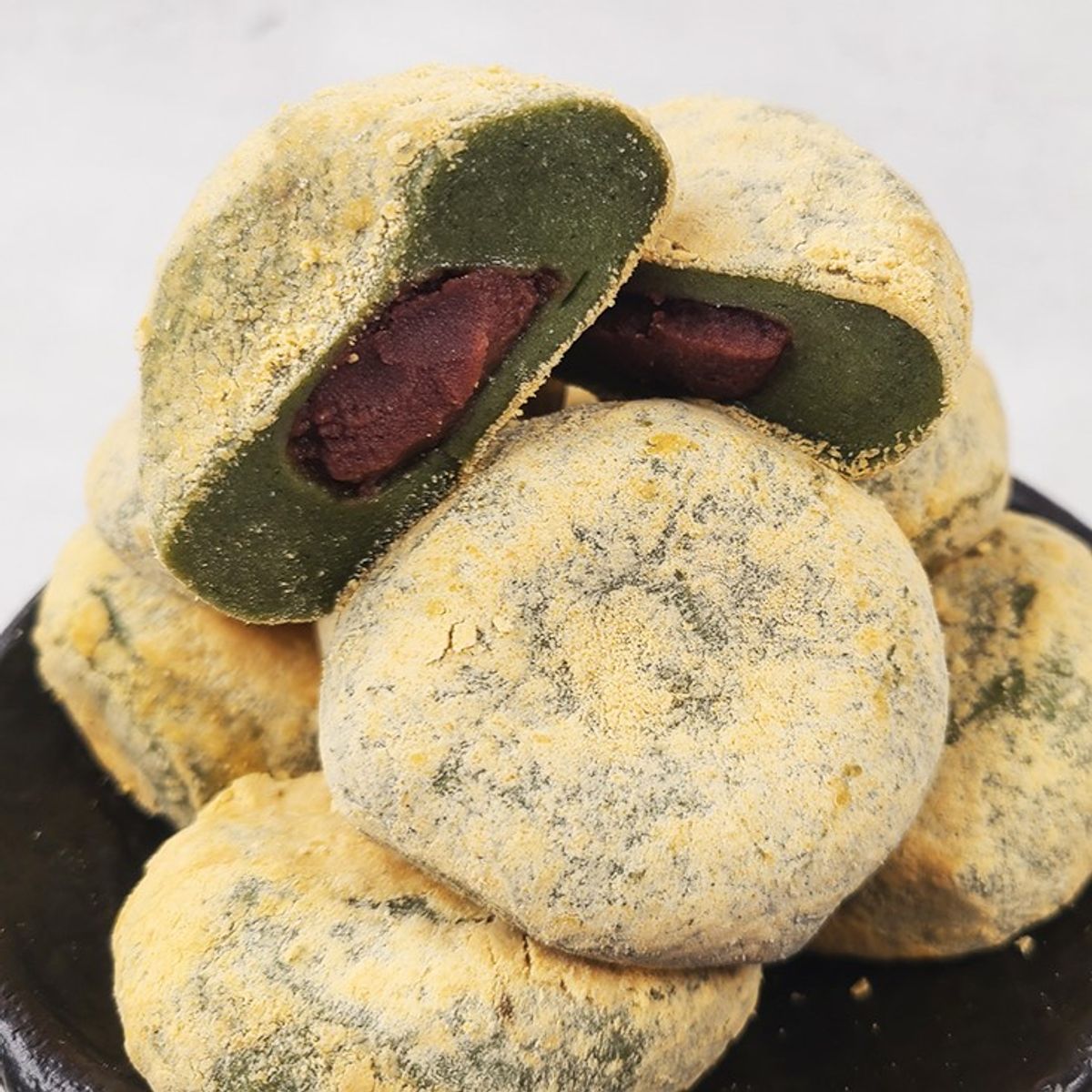 쑥 향 짙은 찹쌀떡에 부드러운 팥앙금을 아낌없이 꽉 채워 넣었습니다. 겉면엔 고소한 콩가루를 묻혀 풍미를 한층 더했죠.
