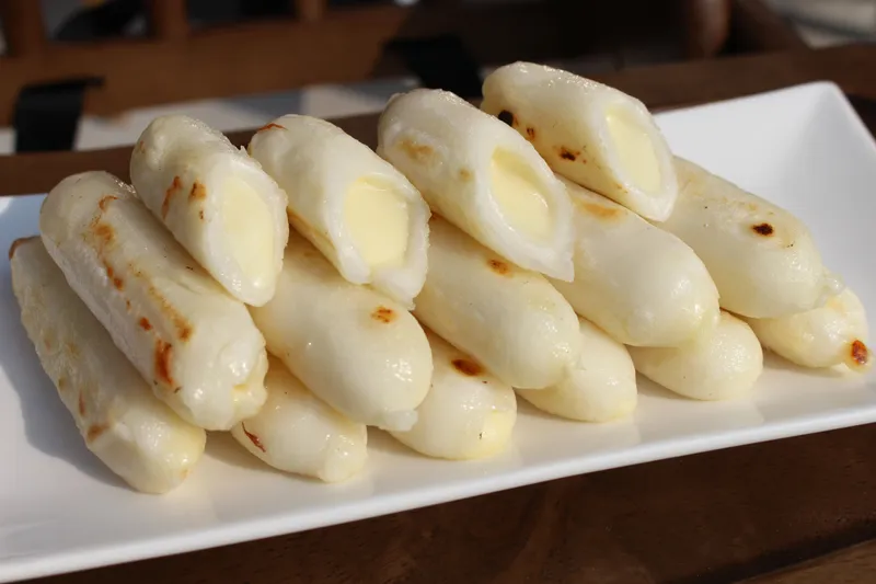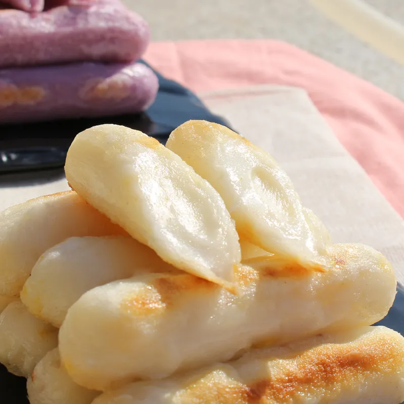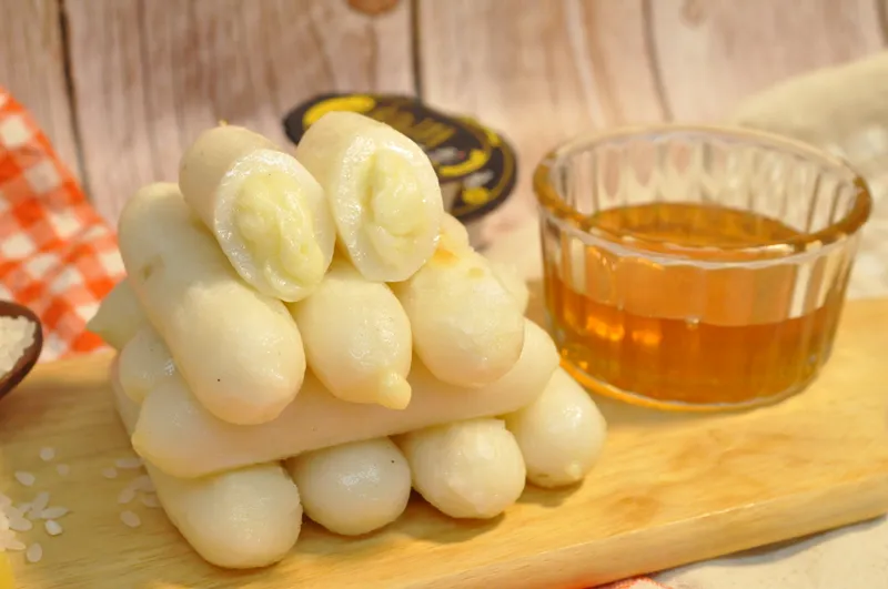 쫄깃한 떡 사이로 진한 치즈 풍미가 늘어져 고소함이 가득한 치즈 가래떡이에요.