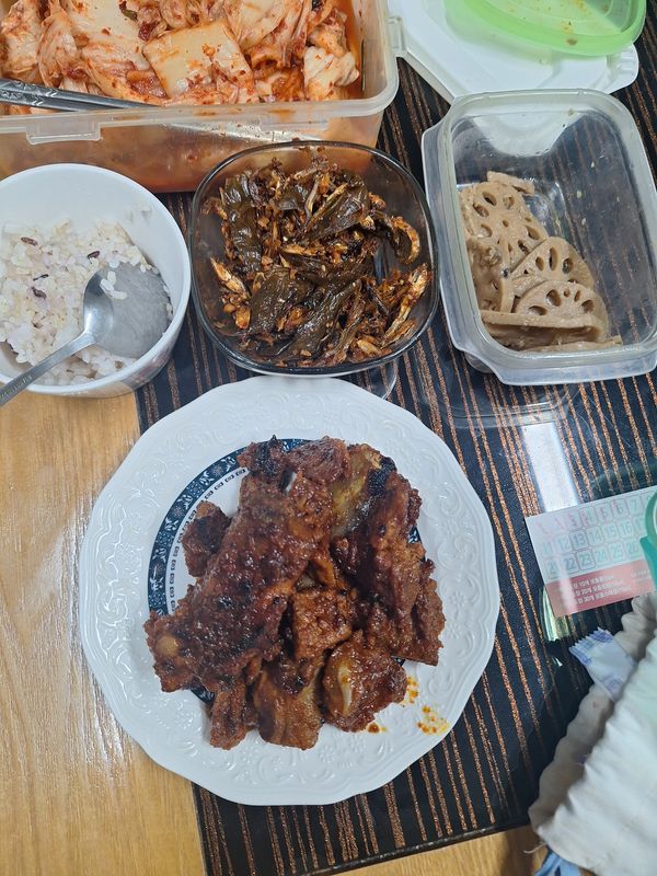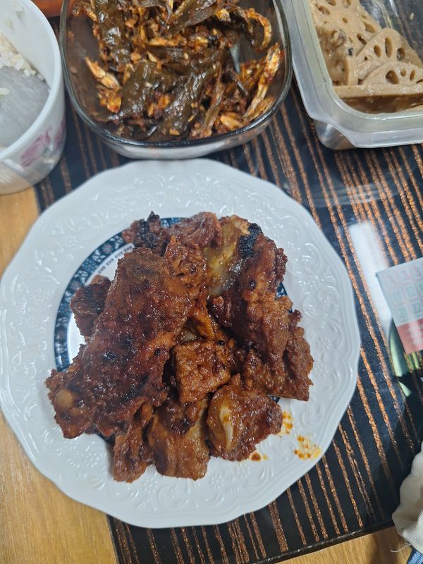 고추장 양념갈비 냉동실에 보관하다 어제 애들시 요리해서 먹었습니다 진한 양념 맛이고 고기도 부드럽습니다