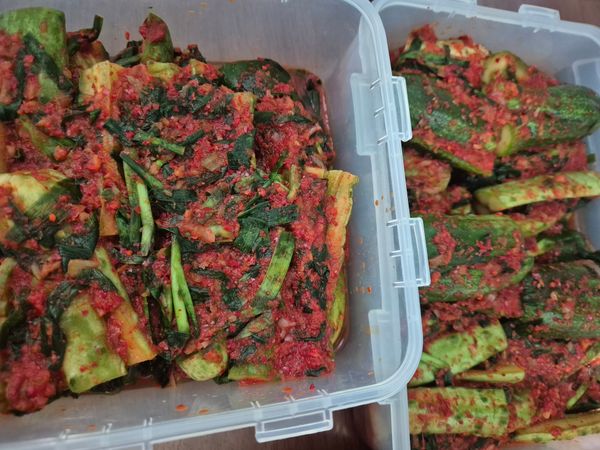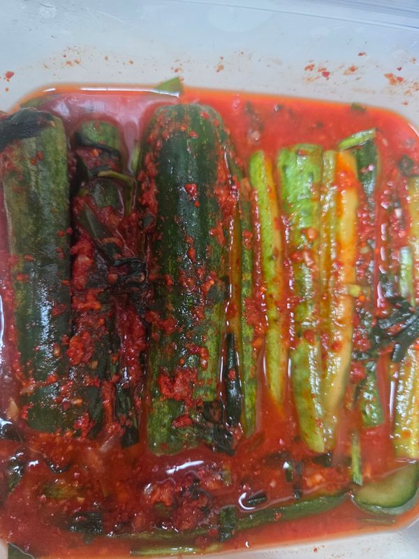포장지가 노후되서 약간 실망이었지만 소박이 맛은 시원해서 좋았어요 약간 너무 오이가 질기고 두꺼웠지만 맛은 좋았어요 거기 채소들이 다 예뻐서 소박이 도 예쁘길 기대했거든요