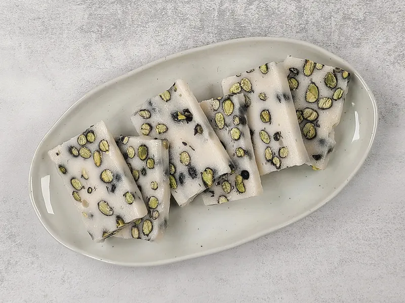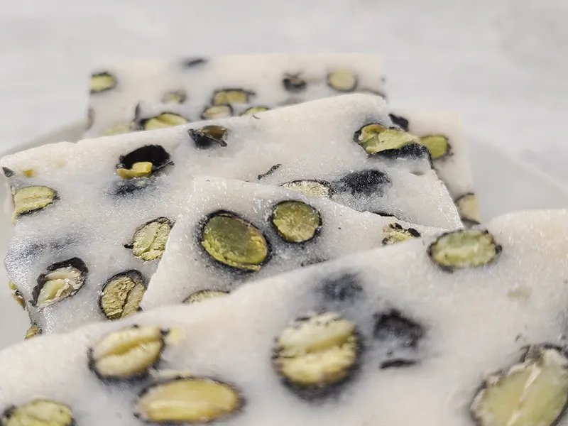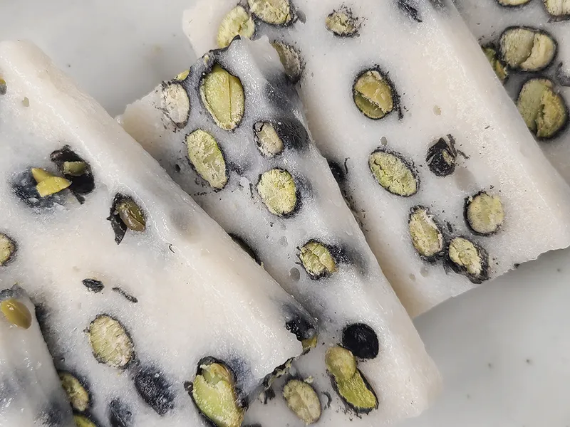 찹쌀로 만들어 손으로 늘리면 쫀득한 찰기가 느껴져요. 떡 속에 고소한 서리태 콩이 콕콕 박혀 오독오독한 식감을 살려줄 뿐만 아니라 씹을수록 은은한 서리태의 단맛이 퍼져요.
