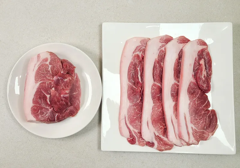 마블링과 살코기가 고르게 분포한 1+한돈 앞다리살