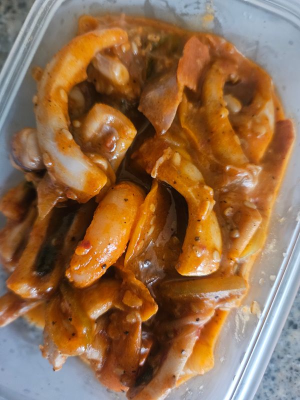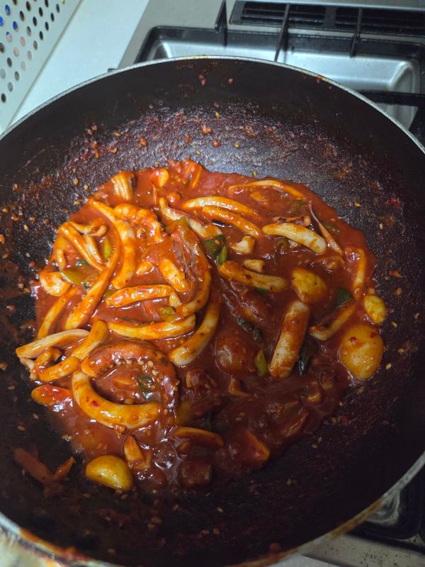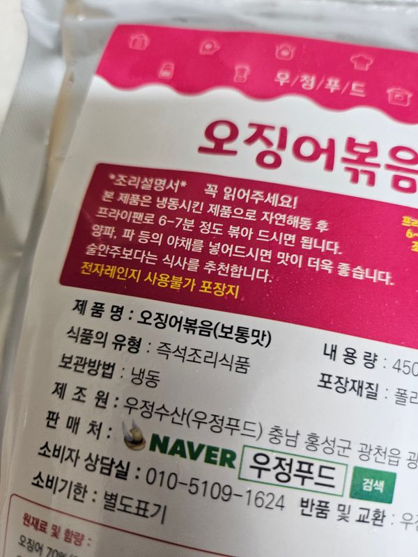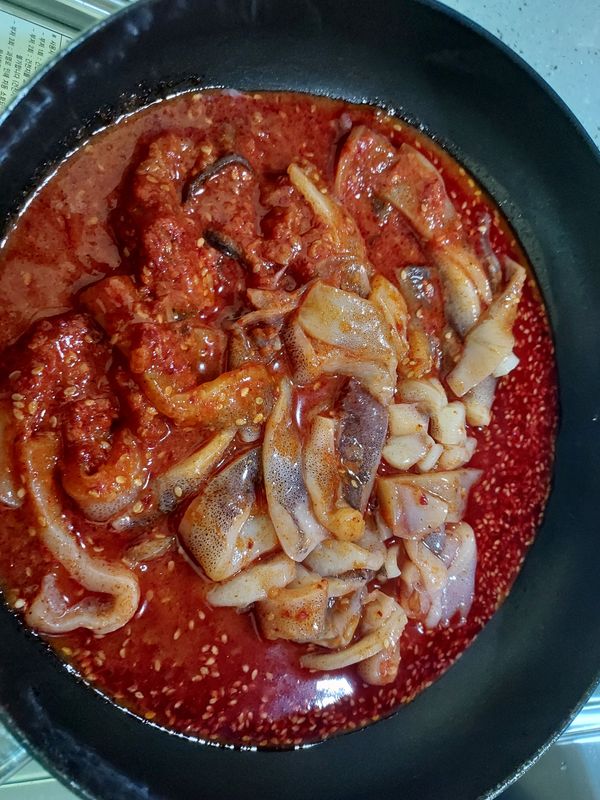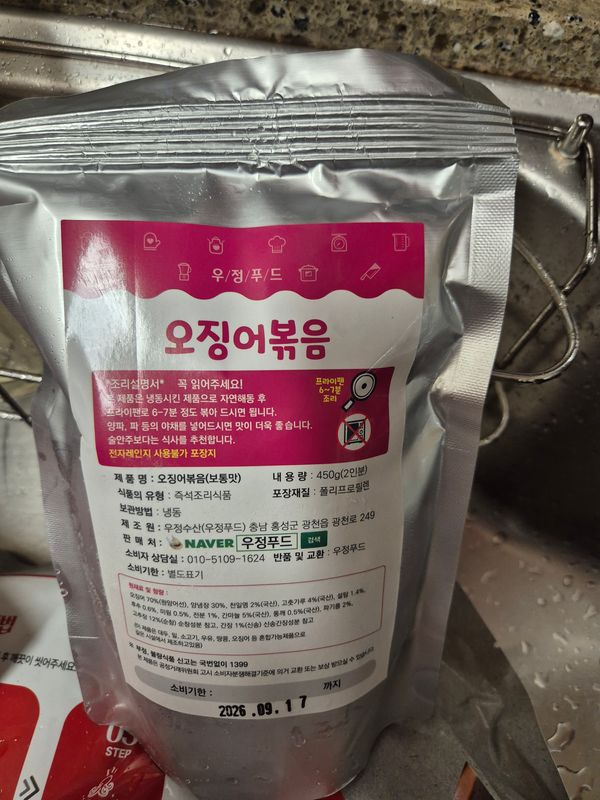 포장지가작아서 양이너무작은거아닌가했는데 오징어만 듬뿍담겨있었고 양념도 크게짜지안아서 야채많이 넣었더니 적당하니 맛있습니다 만족합니다