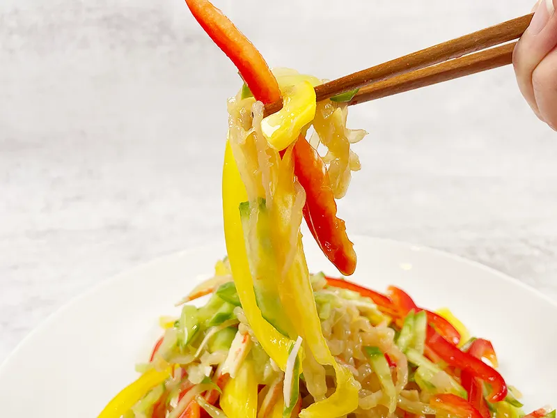 꼬들꼬들한 해파리살, 아삭한 국산 채소, 새콤한 소스의 조화를 맛볼 수 있는 해파리냉채입니다. 새콤달콤하면서도 코를 톡 쏘는 맛이 입맛을 돋우어 줘요. 손님 대접하는 음식으로도, 우리 집 메인 반찬으로도 손색없어요.