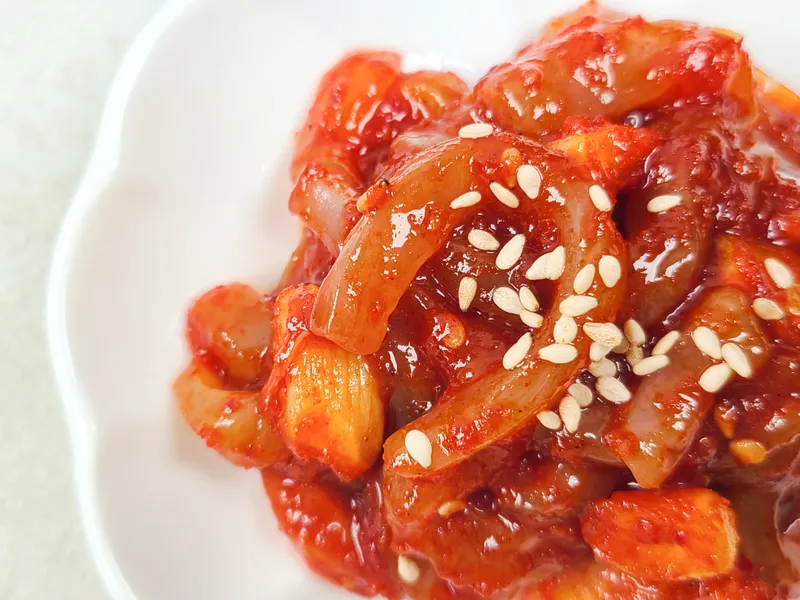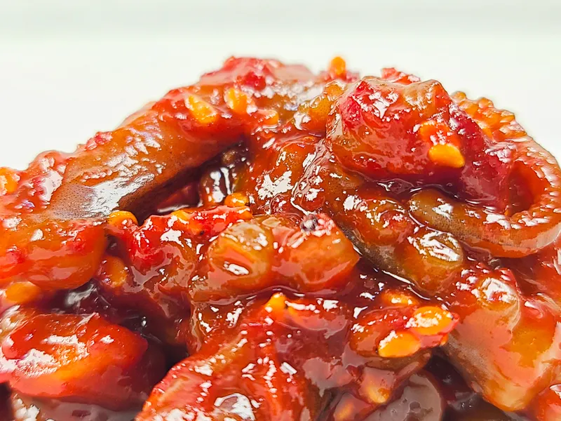 입안 가득 퍼지는 쫄깃한 식감과 매콤 달콤한 양념이 어우러진 낙지 젓갈입니다.