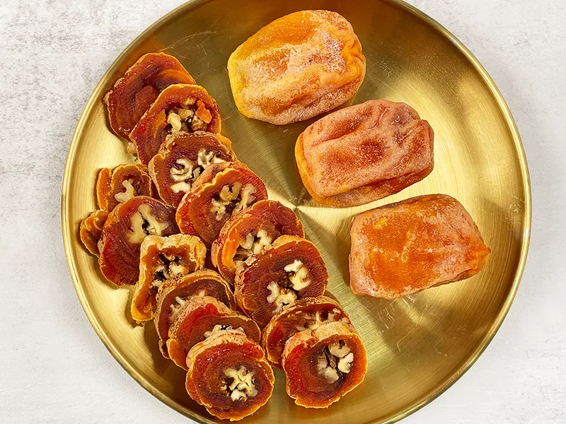 간혹 곶감 겉면에 하얀 분이 묻어 있을 수 있습니다. 이는 곶감의 당 성분이 올라온 것으로 안심하고 드셔도 됩니다.