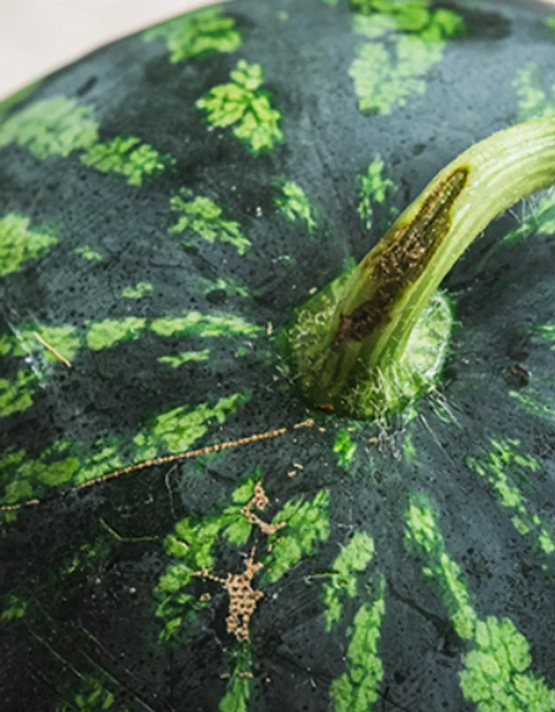 수박 당일 수확 후 쌓는 과정에서 꼭지가 눌리거나, 택배 배송 중 수박 품종 특성상 열이 많아서 꼭지 부분이 마르고 색이 진해질 수 있습니다.