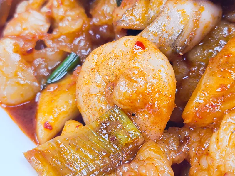 매콤한 양념에 낙지, 곱창, 새우의 풍부한 감칠맛과 식감이 조화된 한 그릇 요리예요. 쫄깃한 낙지, 쫀득한 곱창, 탱글한 새우가 각각의 매력을 발휘하며 입안에서 다채로운 식감을 선사합니다.