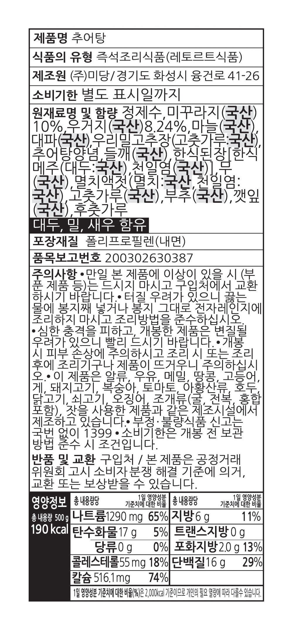 상품정보 제공고시 (원재료 및 원산지 등)