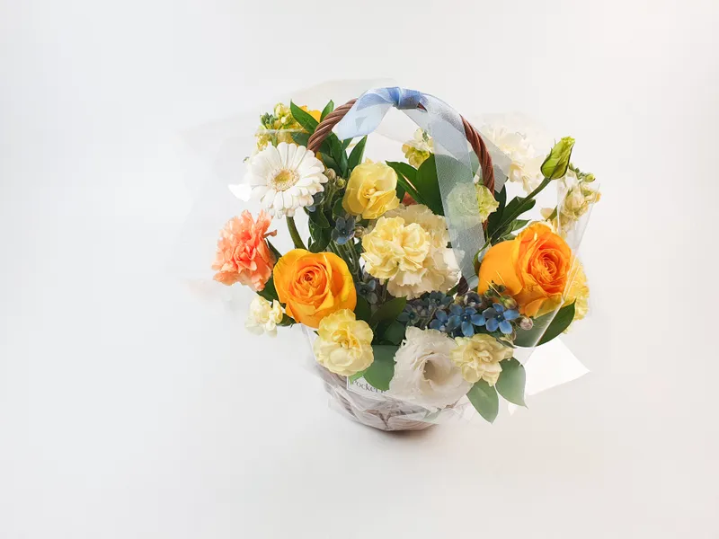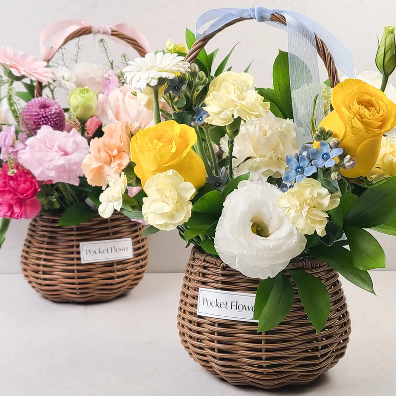 아름다운 수입 장미와, 카네이션, 거베라를 중심으로 구성된 생화 원형 꽃바구니 2종입니다. 계절마다 바뀌는 국산 꽃들을 함께 구성해 노랑&파랑 빛 꽃바구니, 핑크빛 꽃바구니 두 종류로 준비했어요.